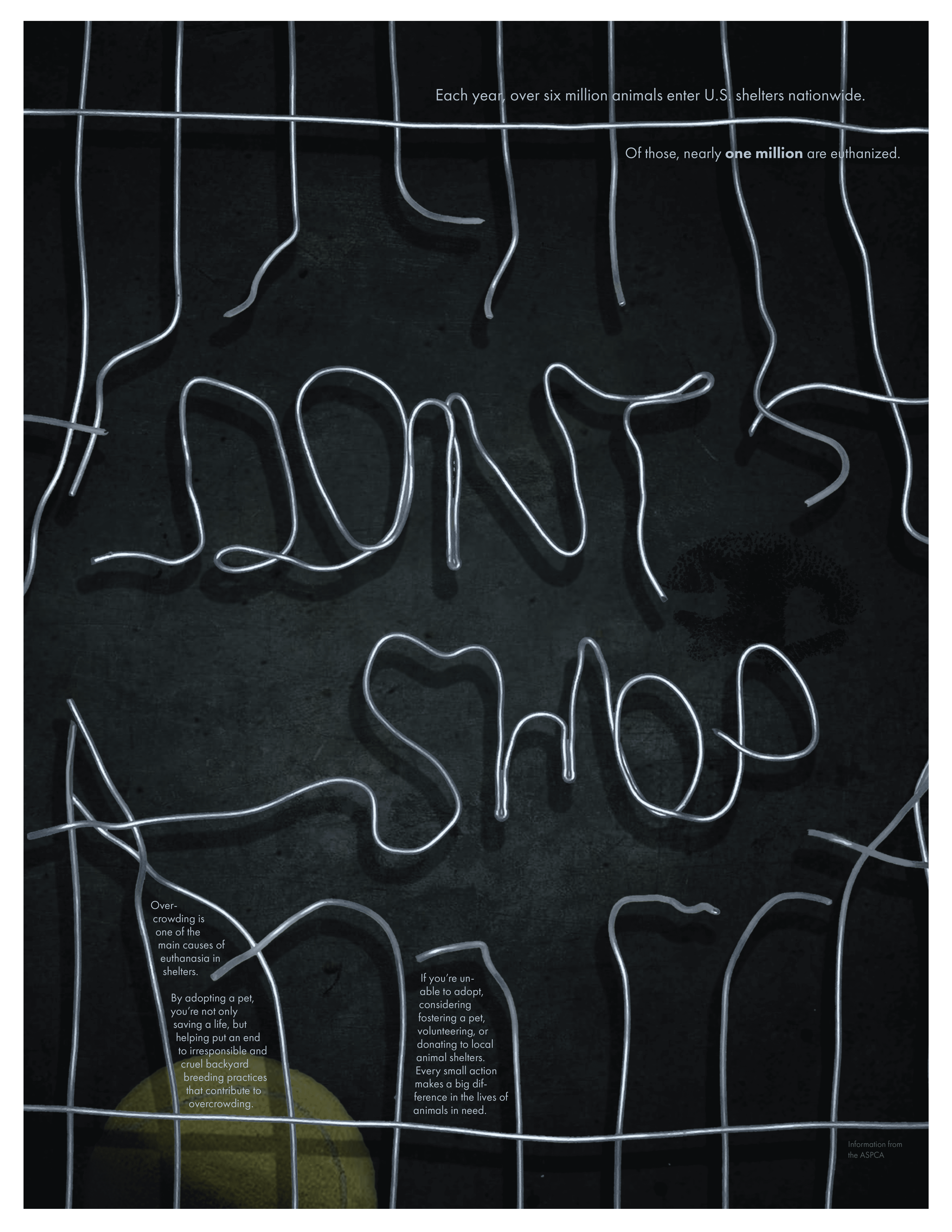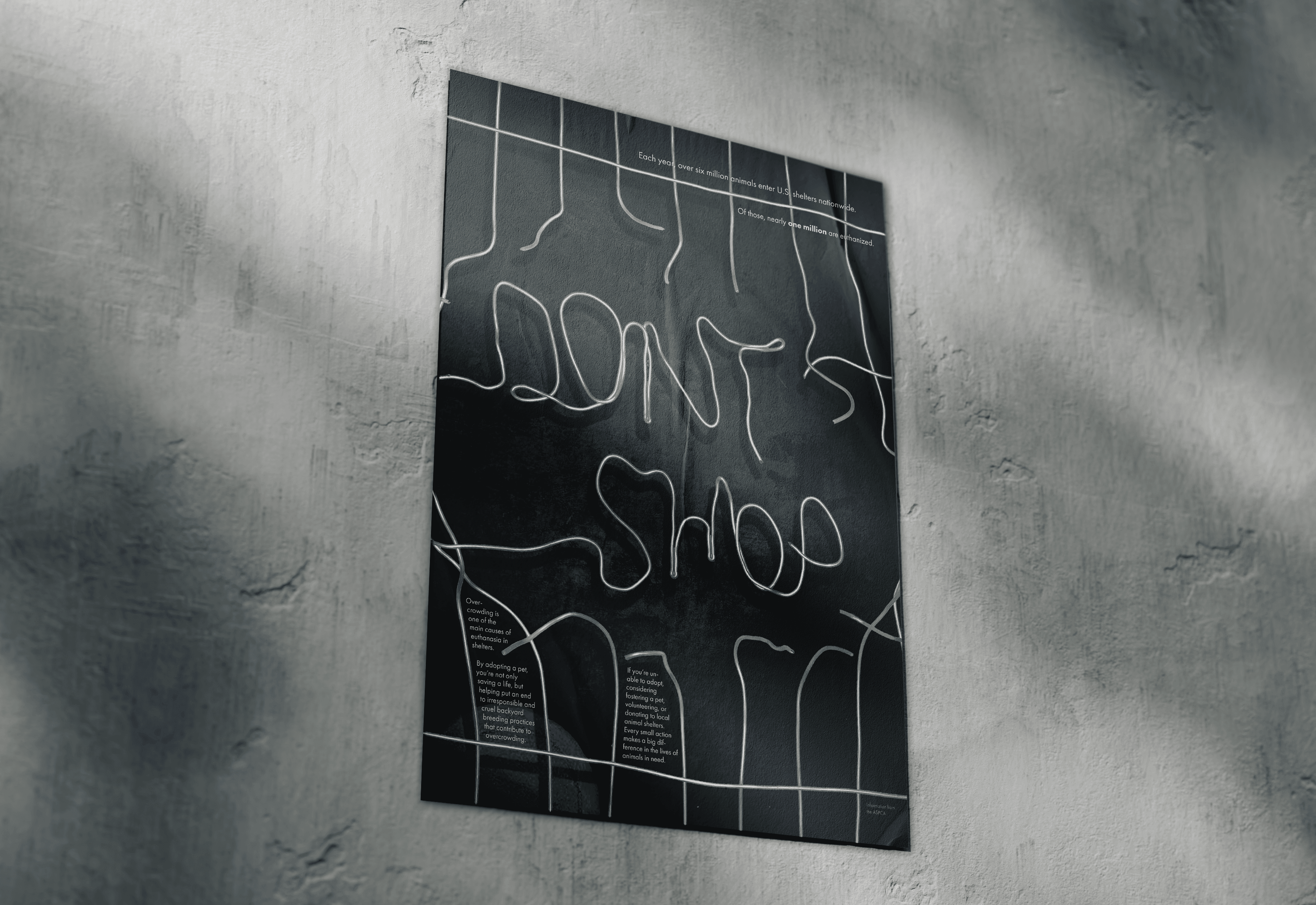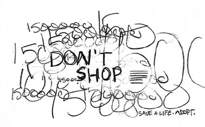 typographic poster advocating for the adoption of pets from shelters rather than stores or backyard breeders with irresponsible practices
